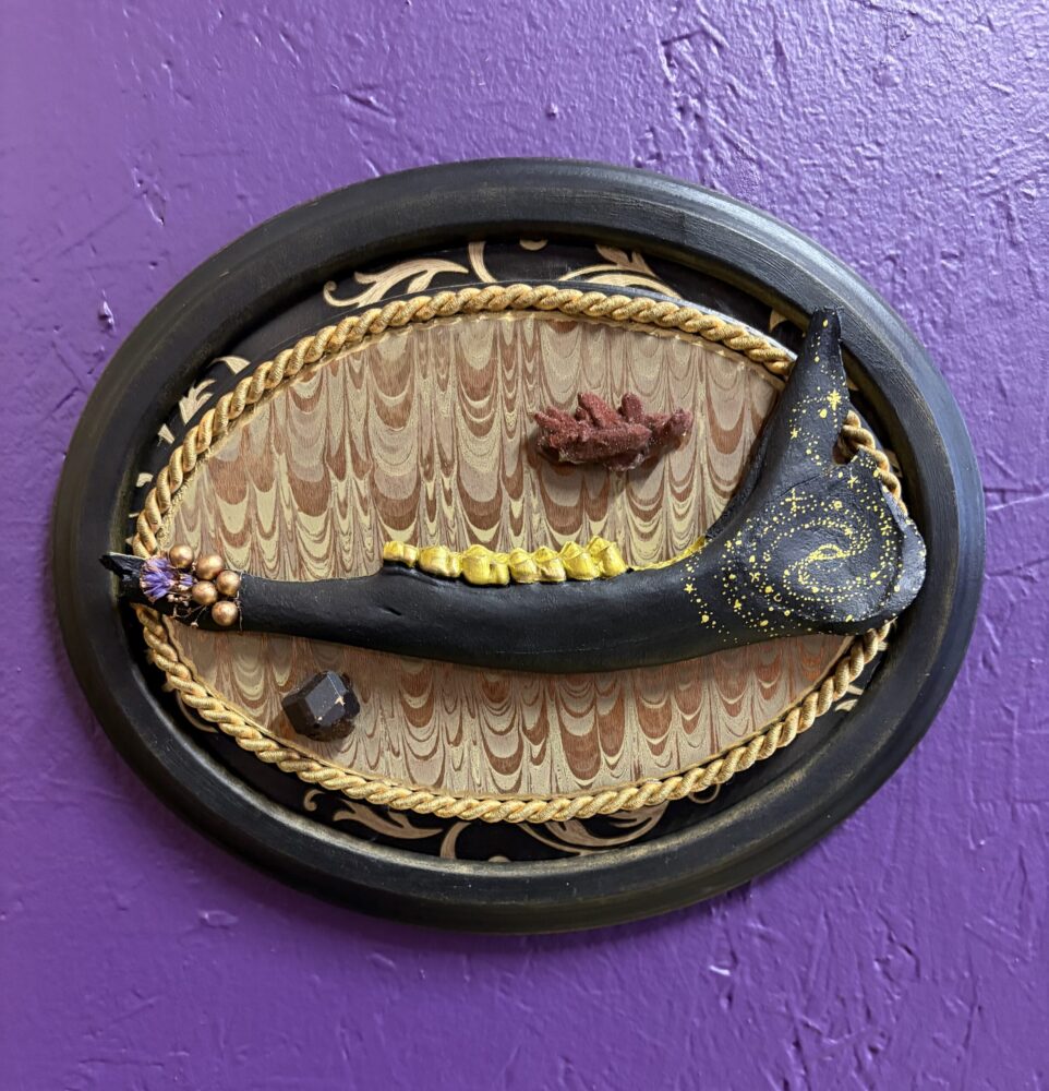 One of a kind, hand painted “Celestial Jawbone” made from found deer jawbone, displayed in layered, upcycled frames, with garnet and Moroccan hematite on repurposed wrapping paper.