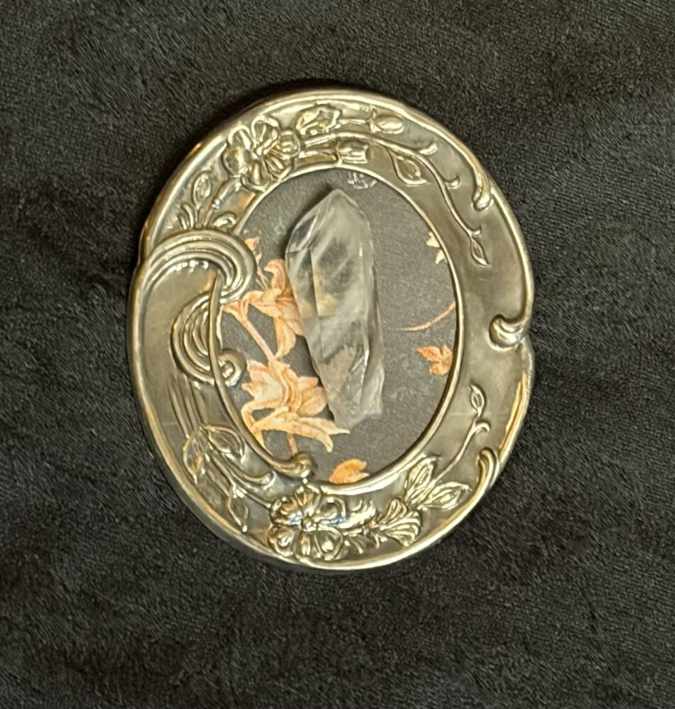 Blue Tara quartz point on floral paper backing, in a pretty little, vintage frame.