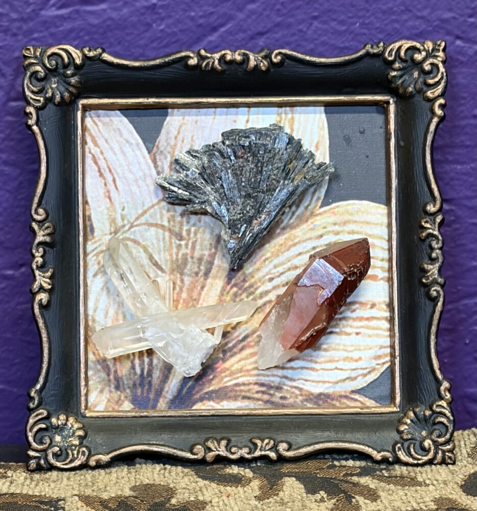 Quartz cluster, Moroccan hematite quartz, and black kyanite fan on repurposed paper backing in upcycled, vintage frame.