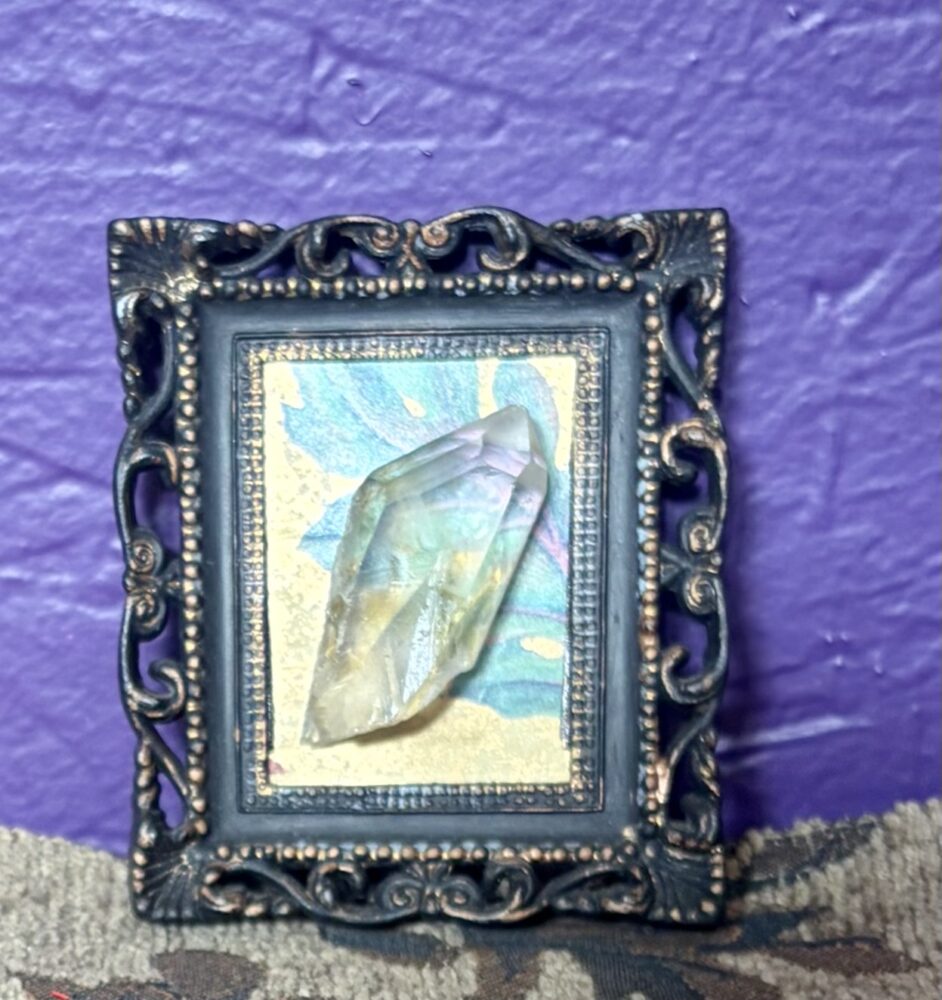 Clear quartz crystal point nestled in a tiny, ornate, square frame with beautiful vintage, hand marbled paper backdrop,