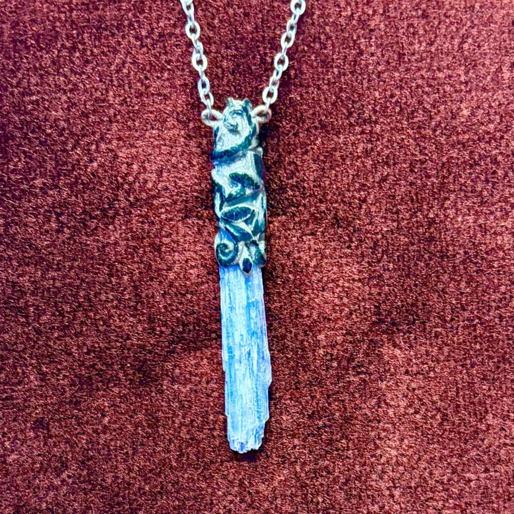 Raw green kyanite crystal pendant set in rusting silver with matching chain.