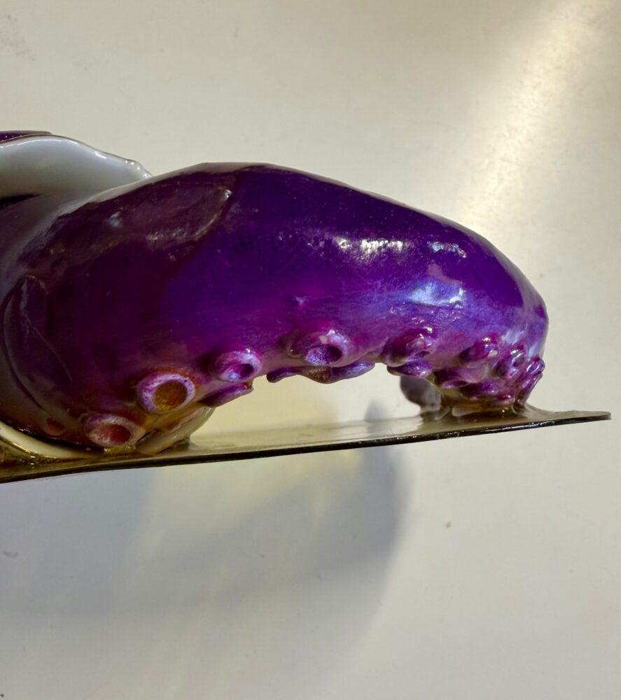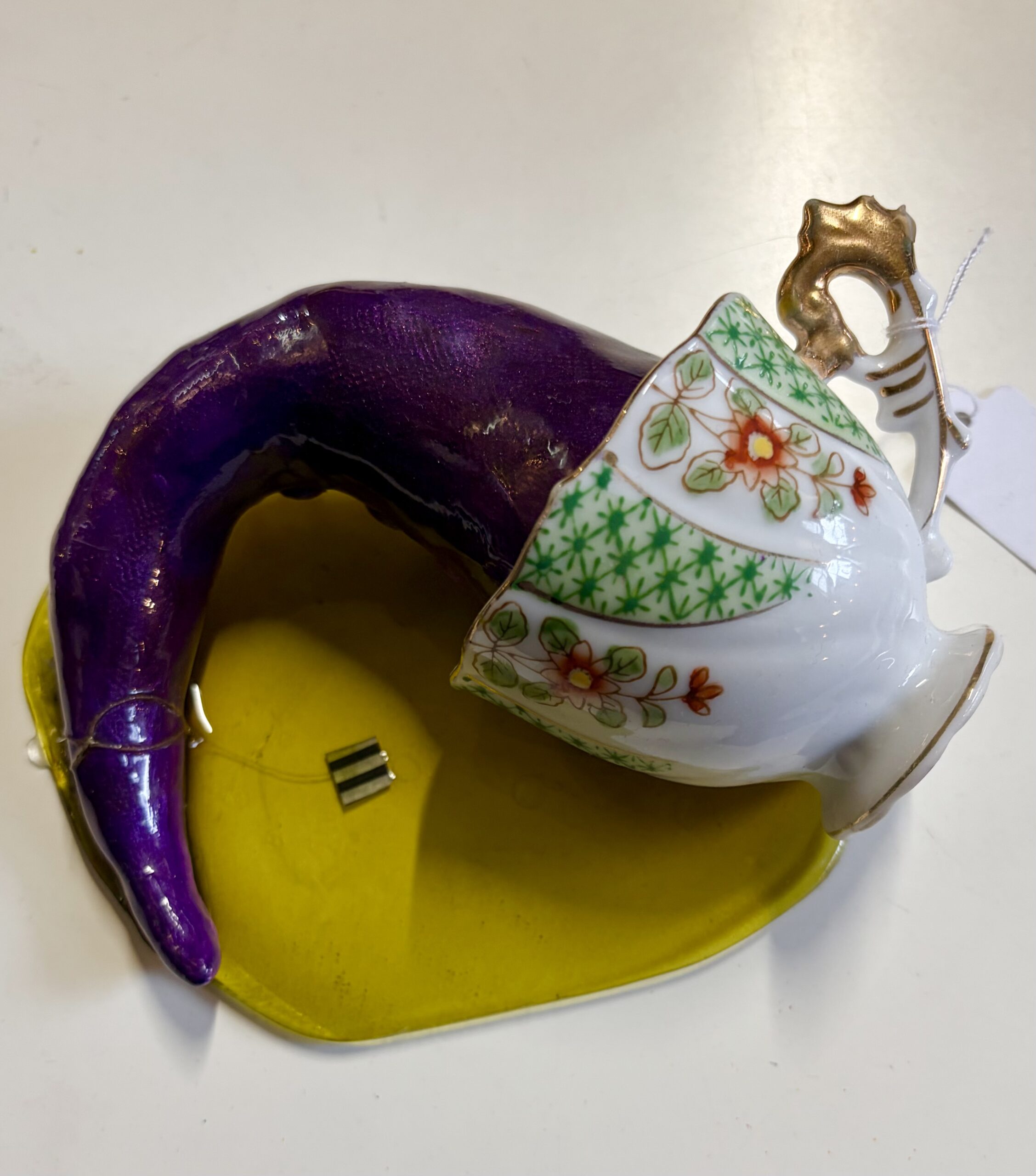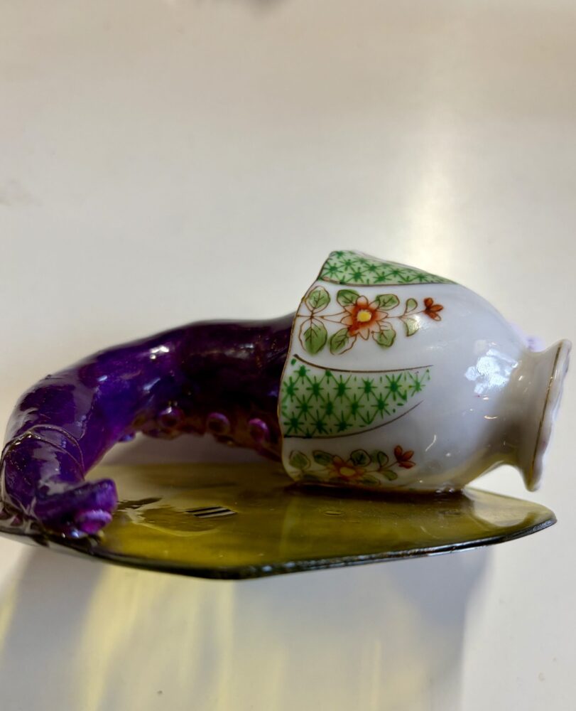 “Spill the tea” Upcycled demitasse cup, ooak polymer clay sculpture.